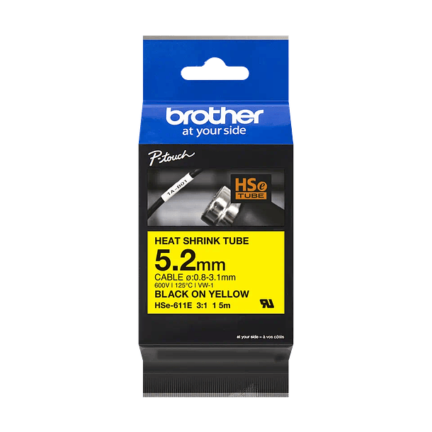Cinta tubo termorretráctl para la identificación de cables Recomendada para electricistas e instaladores, la cinta termorretráctil Brother HS está diseñada específicamente para marcar e identificar permanentemente cables y conexiones con una relación de contracción de 3:1, La etiqueta sale del equipo en forma de tubo y se coloca sobre el cable a señalizar, pasando el cable por el cilindro interior. Una vez colocado, se usa una pistola de aire caliente para que ajuste y quede adherido al cable de forma permanente. Es compatible con las impresoras de etiquetas P-touch que muestran el logotipo HS o HSe en la cubierta del casete de la cinta. Garantiza resultados duraderos y legibles